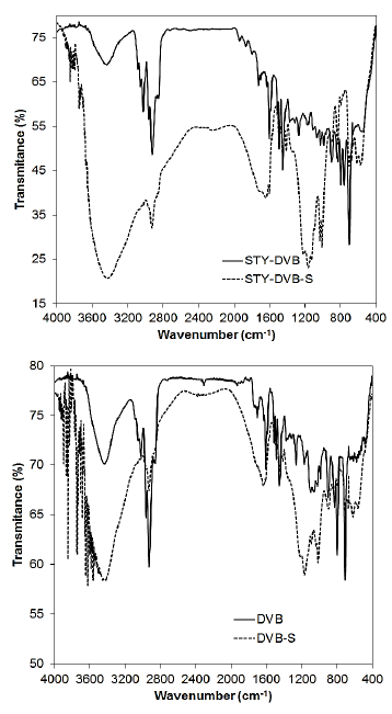 The infrared spectra were obtained to investigate the effects of the sulfonation reactions of the resins GMA-DVB (7:3), DVB(7:3) and STY-DVB(7:3). The appearance or modification of bands in the spectrum of the base resin indicates structural alteration due to the chemical modification. Since the objective of the infrared analysis was only to verify the occurrence of a sulfonation reaction, we expected identical results for these resins as for the other materials with the same composition. This expectation was borne out because the coloration observed through optical microscopy corroborated the previous results.