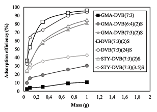 We evaluated the efficiency of the sulfonated resins in terms of the influence of the resin composition, surface area, pore diameter and ion exchange capacity. The tests were conducted at room temperature (25 ºC). The results of the efficiency of ammonium ions adsorption of all the resins tested are presented in Fig. 9. The relative error of each test was set at 5%. The resins based on DVB presented the best results, with 95% and 93% adsorption efficiency levels for DVB(7:3)(2)S and DVB(7:3)(24)S, respectively (resin mass = 1 g). The results obtained for these two resins suggest that the efficiency, in this case, was more closely related to the resins’ surface areas (Table 2) than their ion exchange capacities (Table 3), not only when comparing these two resins with each other, but also when comparing them with the other resins.