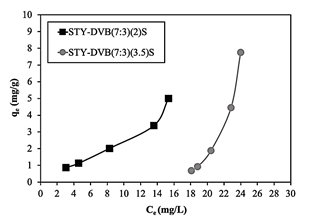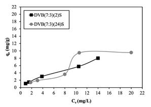 For the sulfonated DVB resins, the adsorption isotherm graph in Fig. 10 again shows that DVB(7:3)(2)S had better adsorption capacity than DVB(7:3)(24)S, since its ion exchange capacity was greater (as reported in Table 3). With respect to the porosity of these two resins, the surface area values were very close (444 and 415 m2/g), suggesting that for this resin, the adsorption capacity is directly related to its surface area.