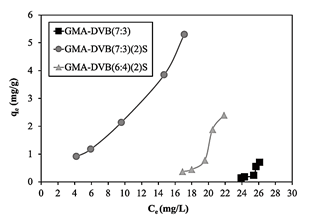 Figure 11: Adsorption isotherms of GMA-DVB(7:3), GMA-DVB(7:3)(2)S and GMA-DVB(6:4)(2)S.