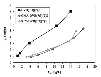 Fig. 13 presents the graphs of qe versus Ce of the three resins obtained under the same conditions of diluent ratio and sulfonation time. As can be seen in Table 3, the exchange capacities of DVB(7:3)(2)S, GMA-DVB(7:3)(2)S and STY-DVB(7:3)(2)S were 2.70 mmol/g, 2.75 mmol/g and 3.35 mmol/g, respectively, while their surface areas were, in the same order, 444.08 m2/g, 40.43 m2/g and 43.05 m2/g. Fig. 13 shows that DVB(7:3)(2)S had the highest adsorption capacity. Although this resin had similar ion exchange capacity as the resin based on GMA, its surface area was much greater, allowing greater contact with the contaminant and the resin’s surface, modified with sulfonic groups, able to interact better with the contaminant.