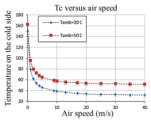 Based on the results, it is observed that increasing the air flow velocity, leads to a decrease in the temperature on the cold face of the TEG, a condition that can be seen in Fig. 9, where the ambient temperature was evaluated for the cases of 30ºC and 50ºC. For Tamb=30ºC and maximum velocity, a temperature Tc=32ºC. was obtained. For Tamb=50 and maximum speed, Tc=52ºC was reached.