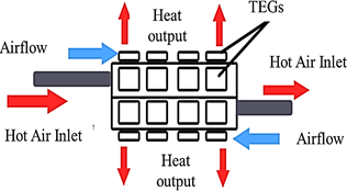 As can be seen in the Fig. 2, hot gases enter the device and release heat through the side walls. While, the thermoelectric modules are subjected to a gradient, as on the outer face, a flow of room temperature air flows over each heat sink. While Fig. 3 shows a three-dimensional drawing of the proposed system.