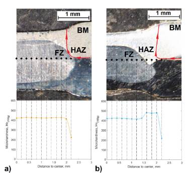 Figure 8: Macrostructure and microhardness profile: a) DP600/AISI304, b) DP600G/AISI304.