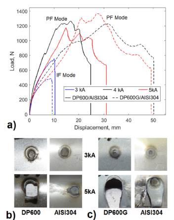 Figure 7: a) Load-displacement curves (t = 500 ms). Failure modes of specimens: b) DP600/AISI304 and c) DP600G/AISI304.
