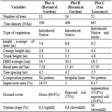 The variables collected in each plot were: number and density of trees; vegetation type (native or introduced - exotic or native); total height, canopy height and trunk height (to the first fork) of all inventoried individuals; diameter at breast height (DBH) of individuals with > 5 cm, and basal area; average tree spacing (average spacing of the closest trees); plot composition pattern (aligned or without a defined pattern); the amount of impervious area (measured with a tape measure); ground cover (the form of ground cover) and terrain slope.