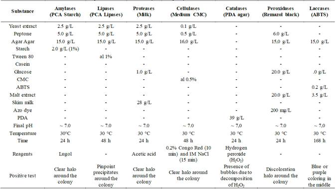 The biochemical characterization consisted of qualitative tests to evaluate the production of amylases, lipases [22], proteases [23], cellulases [24], catalases [25], peroxidases [27] and laccases [26]. The culture media used to induce production and determine the presence (+) or absence (-) of the enzymatic capacity of the isolated specimens, as well as the way of determining whether the test is positive or not, are specified in Table 1. Additionally, negative controls were made to have a reference point. To carry out these tests, the fungi were previously cultivated for a week at 30 °C on PDA agar (Merck) and from this culture a cut of approximately 5 mm of a piece of agar with mycelium of the fungus was made and transferred to each one of the media. The cultures were incubated at 30 °C for 3-4 days before developing the test.