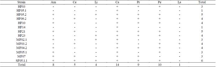 (+) shows activity, (-) shows no activity. (Am) amylases, (Ce) cellulases, (Li) lipases, (Ca) catalases, (Pr) proteases, (Pe) peroxidases and (La) laccases. Source: the authors.