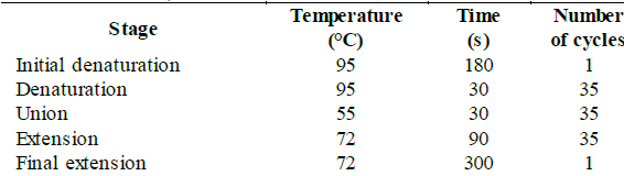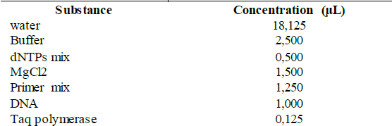 Table S2: Concentrations of the PCR reagents of 25 uL according to the recommendations of the commercial company Thermo Scientific for the enzyme "Taq DNA polymerase" (native, with BSA) # EP0072.