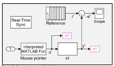 Another block in Fig. 5, "Mouse pointer", captures the mouse position in the screen based on the function "gpos" of Matlab. The "y" coordinate of the pointer corresponds to the u' signal. The blocks "ul" and "yl" in Fig. 5 record the data generated during the simulation and make it available for use in the workspace of Matlab. The signal "ul" corresponds to the actions of the human controller, while "yl" provides the corresponding emulated position given the scaled model. Finally, the block "Real-Time Sync" allows the running of the simulation in real time using the toolbox Simulink Desktop Real-Time, which sets the sampling time at t' s .