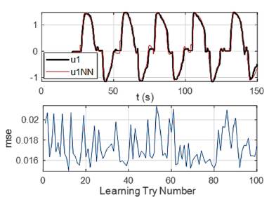 On the other hand, Fig. 7 shows the performance of 100 Neural Networks with four neurons in the hidden layer. The upper part of the figure presents the actuating signal of the Network with the best performance (ulNN) in contrast with the actuating signal of the human (ul). The network closely follows the human control behavior, especially in the zones 2, 3, and 4. The lower part of the figure shows the final mean square error (mse) for each training. This error was used as a measure of quality during the learning process. The variation of mse is not big: the best mse is 0.015, while the worst is 0.022.