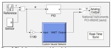 The final and definite test uses the trained Neural Network to control the real plant. The block diagram of the connections inside the computer is shown in Fig. 8. The input of the network is scaled dividing the error by a constant equal to 180. The output of the controller reaches the plant using a data acquisition card, the National Instruments PCI-6024E. This card translates the actuating signal inside the computer into voltages to feed the power amplifier which drives the motor.