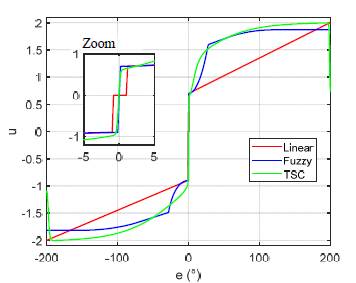 A feasible way to determine the best controller given the information in Fig. 13 corresponds to sum up all the indexes in each surface. Thus, the best controller has the lowest sum, however it is possible to use any other criterion besides the sum, such as the mean value or the maximum. The sum of IAU reaches 273.6 for the linear controller, 261.1 for the fuzzy controller, and 216.8 for TSC. Thus, in average, TSC uses less effort to control the system. The same sum for IAE produces 10634 for the linear controller, 5888 for the fuzzy controller, and 4484 for TSC. Therefore, TSC is the best controller, followed by the fuzzy controller and the last one in the ranking is the piecewise linear controller.