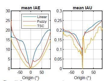 Fig. 11 presents the results for the running of the first experiment seven hundred times. It was necessary to run this number of experiments because the variations from one running to another given that we are working with a real plant. Only when we aggregate that number of experiments the average of them makes the behavior of the controller evident. IAE performance index is symmetric for TSC at the cost that IAU is larger when the origin is positive, which shows that the human compensates the effect of having different gains depending on the rotation sense. That nonlinearity for IAU is larger in the case of the fuzzy controller, so much that the IAE value is smaller for positive origins than for negative origins. IAE value for the linear controller is the highest, as expected, because the actuating signal is smaller than the other two controllers for every error. Another conclusion from Fig. 11 regards the performance of the controllers at small errors, TSC has the biggest advantage in that region simultaneously having the same effort to control than the other two controllers in that region. Being the best controller remains true for the whole rank of origins, but the biggest difference happens at small errors.