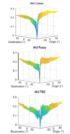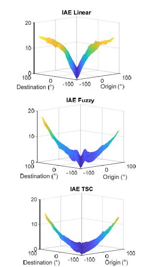 All surfaces in Fig. 12 look like various stages during the fly of a bird and indicate the average IAE value for fifteen experiments. The body of the bird, corresponding to the diagonal with origin equal to the destination, touches the floor with null index value. Any other index value is greater than zero because there is always a transient to go from an origin to a destination. The lowest surface, corresponding to the best controller, is the index for TSC, followed by Fuzzy, however this last surface has a high value when the origins are high negative, as was shown in Fig. 11. The surfaces in Fig. 12 have a symmetry around the axis that goes from one end of a wing to the end of the other wing and shows that the setting in the first experiment properly summarizes the behavior for any origin-destination combination.