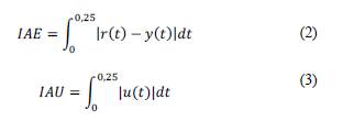 Instead of looking and analyzing the whole transient in each test, we compact the behavior of the system during a test into a single number called performance index. The index IAE (Integral Absolute Error, as defined in eq. (2)), measures the effectiveness of the controller, whereas the index IAU (in eq. (3)) measures the effort of the controller to lead the plant. IAE value indicates the difference between reference and output, whereas IAU value is proportional to the energy used to move the plant by means of the actuating signal u. Thus, a better controller produces smaller indexes. The traditional upper limit for the integrals in eq. (2)-(3) is infinity but given that a normal transient last about 0.15 5, then we consider 0.25 s as the limit of the integral.