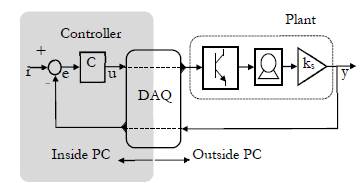 In addition to the motor and the sensors, the plant requires a power amplifier. This stage transforms the actuating signal coming from the controller (implemented inside a computer) into a proportional signal that moves the motor. The connection between the control algorithm and the power amplifier is a Data Acquisition Card (DAQ), which in addition receives the signal from the sensor, as shown in Fig. 2.