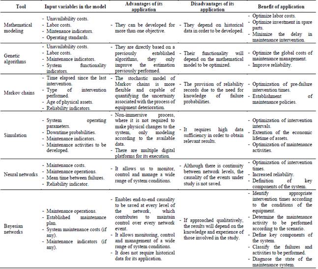 The review carried out allows us to realize the benefits that the application of the optimization tools presented to the maintenance management studies brings with it; In addition, it enables to identify the strongest aspects of each tool according to the objective pursued, as well as the input variables that are most frequently used in this type of models.