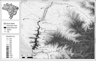 Figure 1: Location of the municipalities surrounding the Itaipu Binacional reservoir and meteorological stations used in the research with their representation of spatial elevation.
