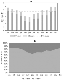 Figure 2: A - monthly average evapotranspiration, with partition of radioactive and aerodynamic parameters and annual mean ETo. B - representation of the ETo portion from radioactive and aerodynamic parameters. ETo was determined by the Penman-Monteith method (PM).