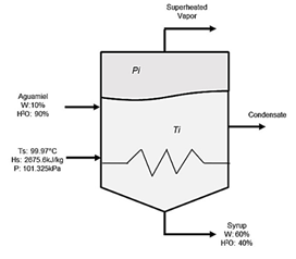 Knowing the percentage of solids in the composition of fresh aguamiel (10%) and the final percentage of solids in agave syrup (60%), the mass flow value of agave syrup (L) was determined according to Eqs. 1, 2, and 3, to determine the massive flow of the input and output currents. The value of the mass flow of saturated steam (V) was calculated later, since in that the current has a percentage of 100% humidity that is to say that it only has water vapor.