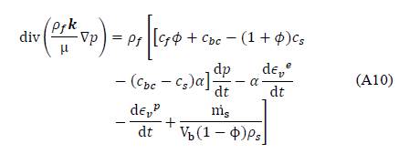 where p f is the fluid density, k is the permeability tensor, 𝜇 is the viscosity, p is the pressure, 𝜙 is the porosity, c f is the fluid compressibility, c bc is the bulk compressibility, c s is the solid compressibility, α is the Biot constant, t is the time, e v e is the elastic volumetric strain, e v p is the plastic volumetric strain, ṁ s is the mass rate of sand production, V b is the bulk volume, and p s is the solid density.