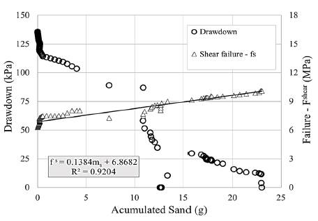 Fig. 6 shows the relationship between the accumulated sand production with the calculated failure function and the measured pressure drop in the four stages of sand production. Fig. 6 shows that regardless of the behavior of the pressure drop across the sample, a strong relationship existed between the amount of produced sand and the calculated failure function; however, no clear relationship existed between the pressure drop and accumulated sanding response. This condition indicated that the increase in the produced sand was associated with the increase in mechanical loading. This assertion indicated that for real-field applications with sanding events, efforts should be focused on determining the loading state of the formation by knowing the real stress path of the different operations, including those involving temperature changes.