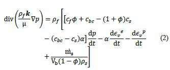The fluid-flow model consists of the integration of the fluid- and solid-mass conservation equations with the monophasic diffusivity equation (Darcy's law) for a slightly compressible fluid. These equations, including the effects of porosity changes due to strain and solid production, result in the final equation for the fluid-flow model (eq. 2). The derivation of the fluid-flow model is shown in Annex A.