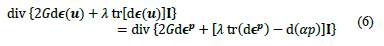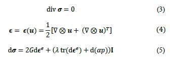 where 𝝈 is the total stress tensor, Є is the total strain tensor, u is the displacement vector,G is the shear modulus, λ is the Lame coefficient, and I is the Kronecker delta. The geomechanical-deformation model for a porous medium with elastoplastic behavior (eq. 6) is obtained from the introduction of eq. (4)-(5) into eq. (3), which yields a model that considers the pressure and plastic strains.