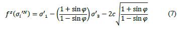 The plastic strains (dЄp) are calculated during material yielding. Then, the displacements are recalculated so that the new calculated stresses satisfy the condition f s (σ i ' N ) = 0. Among the different failure criteria, the Mohr-Coulomb criterion is the most conservative in its predictions, for this reason, Mohr-Coulomb criterion used in this model (eq. 7).