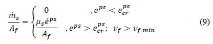 This model assumes that sand is produced only from the cavity faces exposed to fluid flow because sand production is an erosive phenomenon and the eroded grains are large; thus, sand cannot come from inside the reservoir. An innovative element in this model is the relationship between the mass of produced sand and level of plastic failure e ps . This relationship suggests that the amount of sand available for production is proportional to the level of plastic failure associated developed in the porous medium. Finally, the model establishes a minimum flow velocity for the detached grains to be transported by the fluid, i.e., sand is only produced when the fluid velocity exceeds the critical value to transport it ( v f > v f min ). Considering the abovementioned conditions, the rate of sand production is defined as: