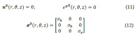 As initial conditions, the pressure at each calculation node is equal to the initial pressure, besides, the initial displacements and plastic strains are equal to zero (eq. 11) (condition of an intact reservoir). The initial-stress state distribution includes axial and horizontal stresses with an isotropic stress condition at the horizontal plane (eq. 12).