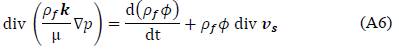 where P f is the fluid density, k is the permeability tensor, μ is the viscosity, p is the pressure, 𝜙 is the porosity, Cf is the fluid compressibility, c bc is the bulk compressibility, c s is the solid compressibility, is the Biot constant, is the time, is the elastic volumetric strain, e v v is the plastic volumetric strain, ṁ s is the sand-production rate, V b is the bulk volume, V p is the porous volume, V s is the solid volume, p s is the solid density, v s is the solid velocity, and v f is the fluid velocity.