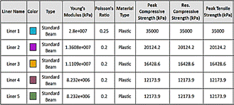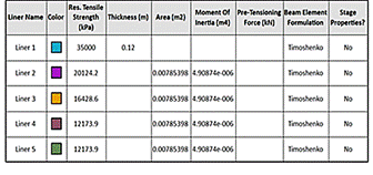 The material properties of the wall and nails are shown in Fig. 5. The upper nails, with lengths of 23.7m and 17.7m, were modeled as Liner 2. The nails with a length of 11.7m and 8.7m were modeles as Liner 3 and Liner 4, respectively. While the vertical nails adopted Liner 5 and the wall Liner 1.