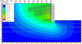 As previously mentioned, the facing was activated simultaneously with the phases of excavation. In the following phase, the nails were activated. Both the nails and the wall were modeled with the "Liner" (bar/plate).