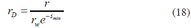 When plotting the dimensionless storativity coefficient as a function of the ratio of the value of the pressure derivative of the minimum of the transition zone with the value of the pressure derivative in the radial flow of the late time (see Fig. 5), we found a correlation that allows the estimation of this parameter with a coefficient of determination of 0.9999999743, that is, Eq. (24).