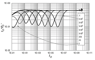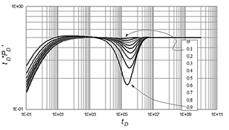 With a variation in the dimensionless semipermeability in a range from 0.1 to 1x10-7, the pressure derivative curves reported in Fig. 1 were generated. In Fig. 1, it can be observed that the decrease in the value of the dimensionless semipermeability generates a decrease in the value of the minimum (with respect to the axis of the pressure derivative) and its displacement to the right.