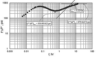 In order to provide an interpretation procedure, it is necessary to find a relationship between the semipermeability, pressure derivative, and time. To do so, the affected parameter, which is time, is multiplied by the dimensionless permeability raised to a given power, which is found by either trial and error or using a mathematical procedure as outlined by [15]. The unified pressure derivative behavior is given in Fig. 3, from which the following equation is obtained: