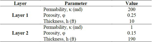 The expressions developed in this study were evaluated using data reported by [1], [4], and [16]. [1] developed correlations for the calculation of the dimensionless storativity coefficient ω in a crossflow reservoir and, in turn, proposed two examples. The schematics of the systems used in Examples 1 and 2 are illustrated in Tables 1 and 2. Example 1 is evaluated by [1] based on the results obtained by [4].