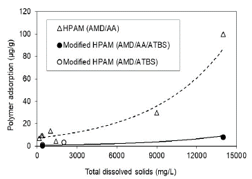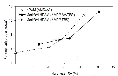 The salinity and hardness of water show a direct relationship with adsorption for the two types of molecules (HPAM and modified HPAM), but modified HPAM's are more resistant to high salinity and hardness conditions. Modified HPAM evidence 50% less adsorption at the same conditions compared with HPAM.