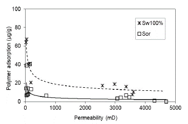 Figure 13: Polymer adsorption in terms of permeability in porous media at Sw 100% y Sor.