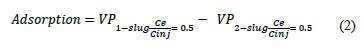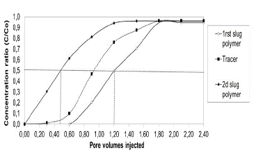 The method used to calculate polymer adsorption was the concentration profile method, which requites breakthrough curves. This method indicates that adsorption and IPV can be calculated directly with the values corresponding to the normalized concentration point (Ce / Cinj) at 0.5 [24,38,39]. Adsorption is estimated as the difference between the 0.5 normalized concentration value of the first and second polymer slug (eq. 2).
