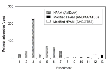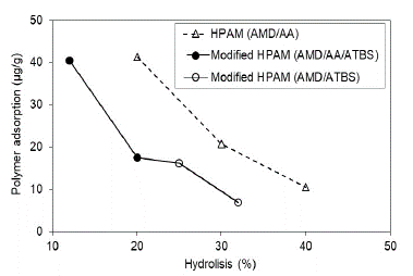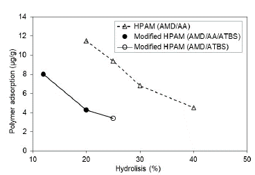 Modified HPAM polymers with ATBS units show the same tendency that HPAM polymers, although with lower adsorption values. The sulfonation degree of modified HPAM increases negative charges in the polymer structure, decreasing the adsorption on the porous media.