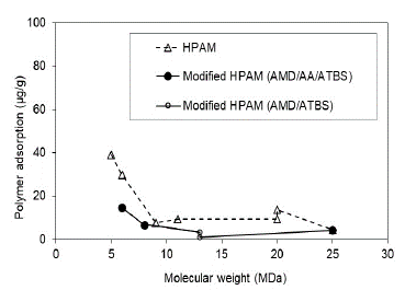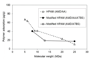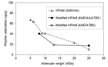 The HPAM and the modified HPAM polymer's molecular weight presents an inverse relationship with the dynamic adsorption. The polymers with higher MW should face constrained access in the porous media.