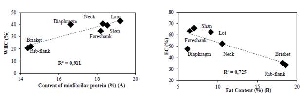 The myofibrillar protein present in the evaluated meat cuts was correlated more than 90% with the water retention capacity shown by the different samples analyzed (Fig. 3). The Rib-flank cut presented the lowest WHC value, which may be due to the high fat content (Table 2) that prevents proteins from being able to bind water molecules due to hydrophobic interactions between fat molecules.