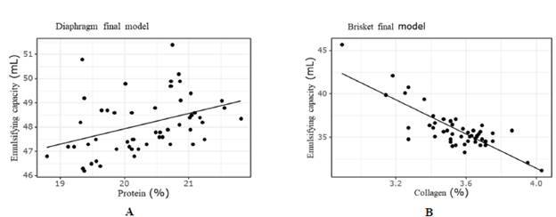Figure 4: Emulsifying capacity for the diaphragm cut, in terms of total protein (Figure A) and emulsifying capacity of the brisket cut in terms of collagen content (Figure B).