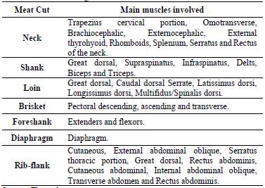 For the neck cut, an incision was made from the atlas to the third thoracic vertebra along the cranial edge of the scapula, descending towards the distal area, looking for the shoulder joint (scapulo-humeral), carving against the vertebrae and removing the entire mass of the muscle. For the foreshank cut, the flexor and extensor muscles of the fingers were separated at the junction with the ulna and radius. The loin cut involved a deep dissection between the third and thirteenth thoracic vertebrae up to the vertebral processes and against the corresponding ribs in their joint.