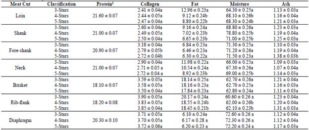 There were collagen differences between the cuts and classifications, as well as in the interaction between them. In general, the cuts from carcasses of the three-star classification were those with the highest collagen content, followed by those from four stars and those from five stars. Rib-flank and brisket cuts were significant different (p<0.05) to neck and loin cuts and to shank, fore-shank and diaphragm cuts. The interactions of meat cut by classification of the carcass from which they come were seen in loin and the neck.