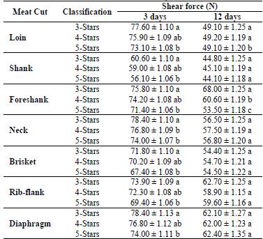Differences in the letters that accompany the values for shear force in meat cuts indicate significant differences. Source: The authors