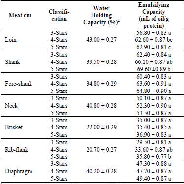The WHC values were significantly different between cuts (p<0.05). The cut that showed the highest WHC was the Loin, responding to the functionality of the myofibrillar protein (protein minus collagen), followed by the shank, neck, fore-shank and diaphragm cuts between which there was no significant difference (p>0.05).